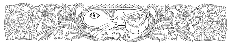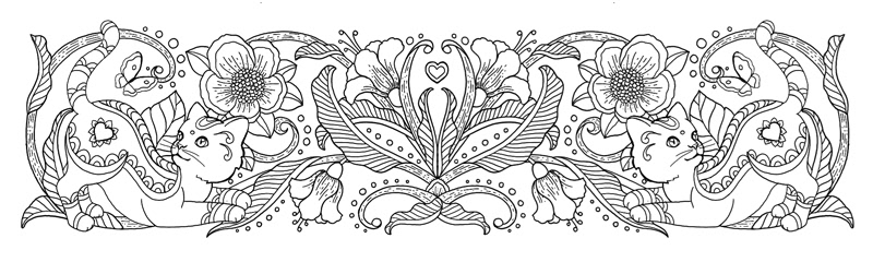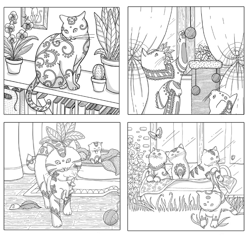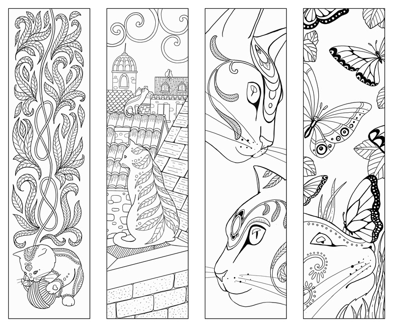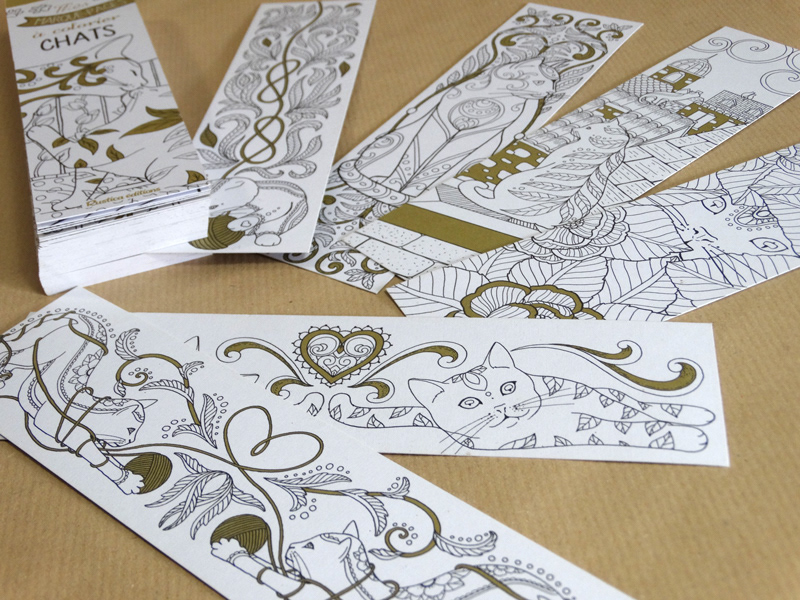 55 cat-themed bookmarks, in a mix of landscape and portrait format, for the "Mes marque pages a colorier" series published by Rustica Editions, France.