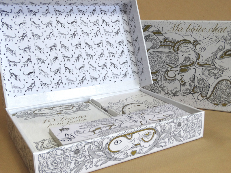 I illustrated both the packaging and content of "Ma boîte chat", a cat-themed cardboard box containing a Book by Valérie Dramard on cat behaviour, a notebook and a small bookmark pad, published by Rustica Edition (Fr) in October 2016.